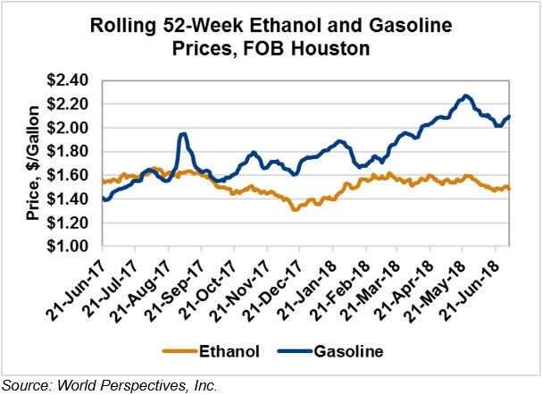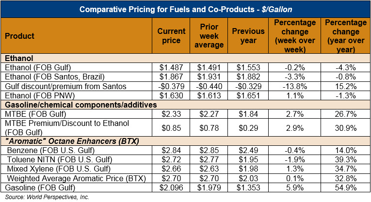 FOB Houston ethanol prices finished last week 0.8 percent higher but are down 0.2 percent through Tuesday. FOB Houston prices are quoted at 39.294 cents/liter (148.744 cents/gallon), a weekly decrease of -0.094 cents/liter (-0.36 cents/gallon).