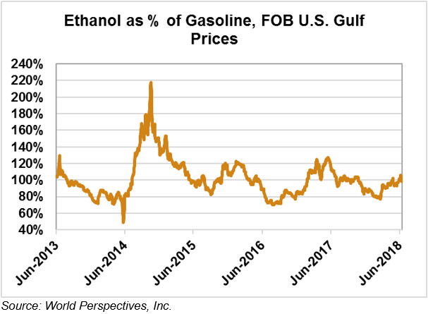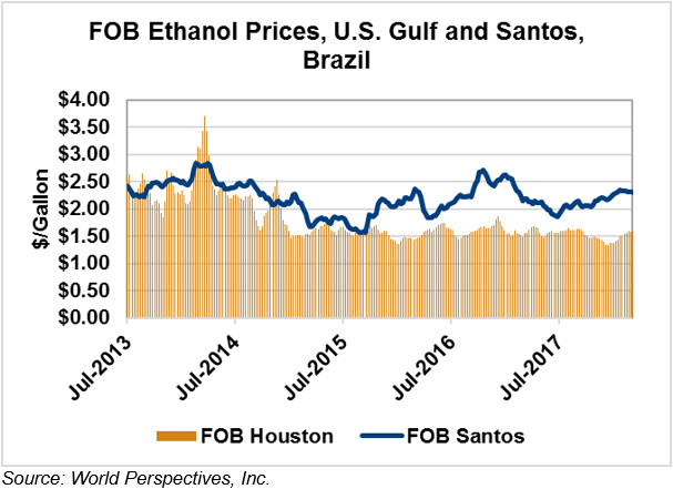 This week the FOB Gulf-Santos, Brazil ethanol price spread is -10.041 cents/liter (-37.906 cents/gallon).