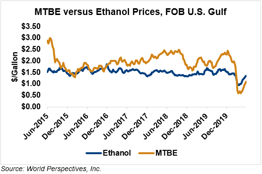 MTBE prices rose 2.7 percent last week and have extended those gains in early week trading, up 10.5 percent from Friday’s close through Tuesday’s trading. MTBE’s premium to FOB Houston ethanol has increased from last week’s report and stands at -6.88 cents/liter (-26.06 cents/gallon).