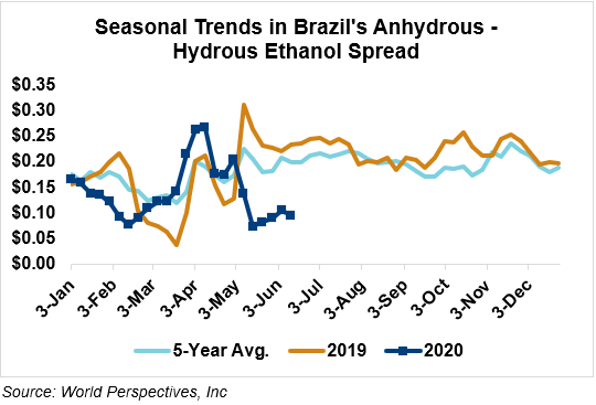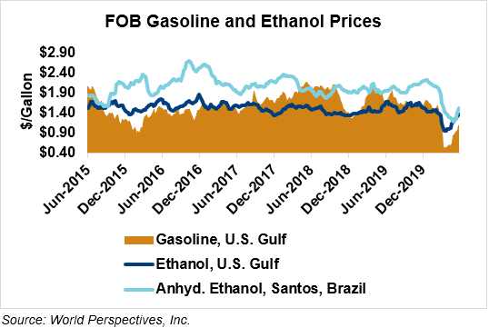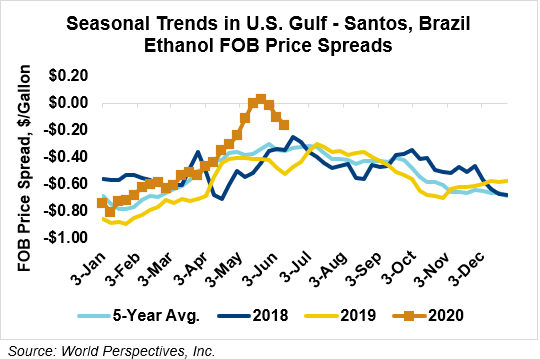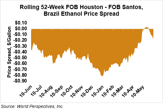 The FOB Gulf-Santos, Brazil ethanol spread has widened from last week’s close through Tuesday’s trading and is currently at -4.41 cents/liter (-16.71 cents/gallon).