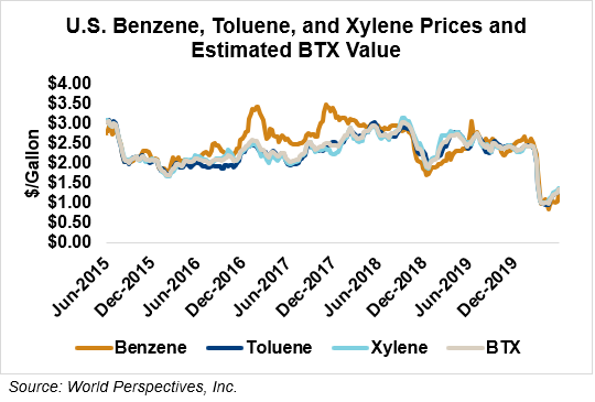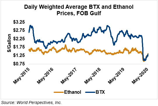 BTX component prices were higher last week and are continuing that trend through Tuesday’s market close: Benzene is up 18 percent while Toluene is up 7.5 percent, and Xylene is up 4.3 percent. The estimated weighted average aromatic price is currently 35.31 cents/liter (133.68 cents/gallon), up from last Friday’s close. The BTX-Houston ethanol spread widened last week, and the weighted average BTX price is -0.88 cents/liter (-3.32 cents/gallon) lower than the FOB Houston ethanol price.
