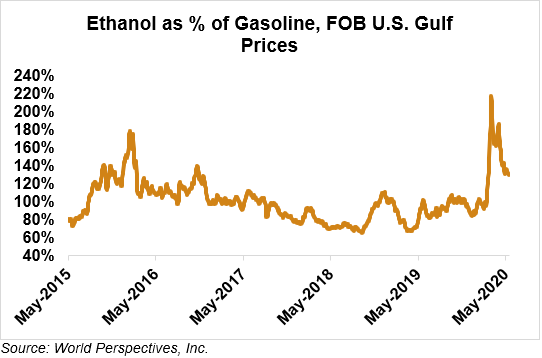 Market Outlook: U.S. ethanol prices ended last week 7.3 percent higher and are extending those gains in early week trading, up 0.6 percent through Tuesday’s close. Midwest wholesale rack ethanol prices were higher to end last week and are up 1.9 percent through Tuesday’s market close to their last quote of 37.08 cents/liter (140.35 cents/gallon).