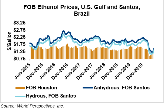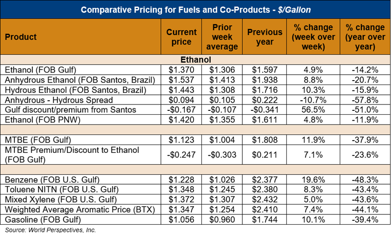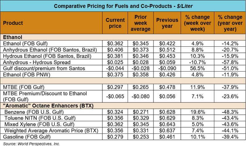 FOB Houston ethanol prices finished last week 3.5 percent higher and are up 4.9 percent through Tuesday’s trading from Friday’s close. FOB Houston ethanol prices are quoted at 36.19 cents/liter (136.99 cents/gallon). FOB Santos, Brazil anhydrous ethanol prices were higher last week; they are up in early week trading, rising 8.8 percent to 40.6 cents/liter (153.705 cents/gallon) through Tuesday’s trading.