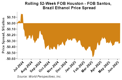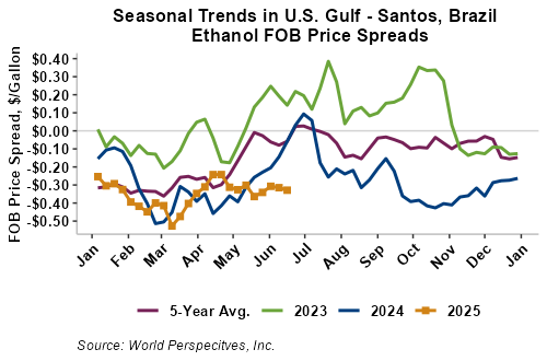The FOB Gulf-Santos, Brazil ethanol spread has narrowed from last week’s close through Tuesday’s trading and is currently at -8.58 cents/liter (-32.49 cents/gallon).