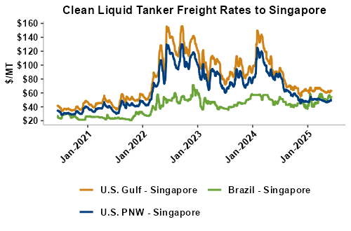 Liquid tanker rates are 1 percent higher on average this week with offers for the U.S. Gulf to the East Coast of Mexico seeing the largest gains (up 35 percent). Freight from the U.S. Gulf to Morocco saw the largest declines and is down 8 percent from last week. On average, tanker freight from the U.S. Gulf is up 3 percent this week while freight from the PNW has posted a 3 percent decline. Liquid tanker freight rates from Brazil are up 2 percent, on average, this week. Freight rates across all origins are 33 percent lower than this same week in 2024.