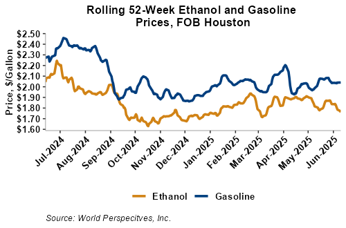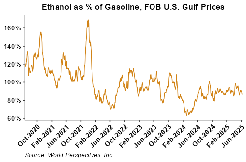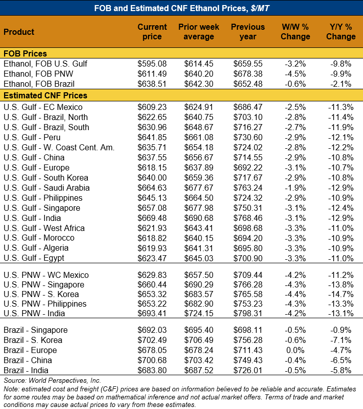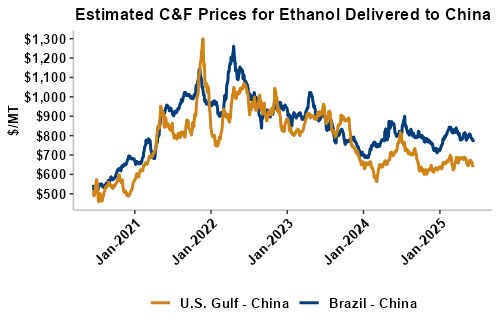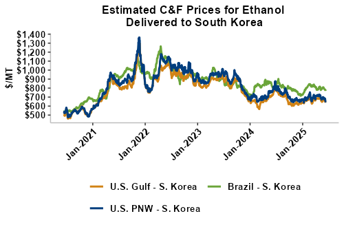 On a cost-and-freight (C&F) basis, offers are mostly lower this week as lower FOB offers for ethanol have offset gains in liquid tanker freight rates. Prices for ethanol C&F to Central America from the U.S. Gulf are down 2.7 percent this week and are down 11.9 percent from this same week in 2024. Values for PNW ethanol to Southeast Asia average $655.66/MT this week, down 4.4 percent from the prior week and down 13.9 percent year-over-year. That compares to U.S. Gulf to Southeast Asia C&F prices that average $647.41/MT and are down 3 percent from last week and are down 11.4 percent year-over-year. C&F prices for Brazilian ethanol to Southeast Asia are down 0.4 percent from last week.