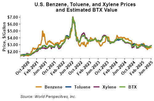 BTX component prices were sharply higher last week but were mixed/firmer through Tuesday’s market close: Benzene was down 0.3 percent while Toluene was up 0.3 percent, and Xylene was up 1.1 percent. The estimated weighted average aromatic price is currently 75.24 cents/liter (284.82 cents/gallon), up from last Friday’s close. The BTX-Houston ethanol spread widened last week, and the weighted average BTX price is 28.71 cents/liter (108.68 cents/gallon) higher than the FOB Houston ethanol price.