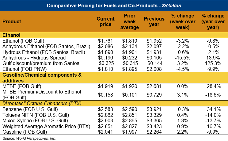 Market Outlook: U.S. ethanol prices ended last week 4 percent lower and were weaker still in early week trading and fell 0.6 percent through Tuesday’s close. Midwest wholesale rack ethanol prices were lower to end last week and were down 0.4 percent through Tuesday’s market close to their last quote of 48.82 cents/liter (184.82 cents/gallon).