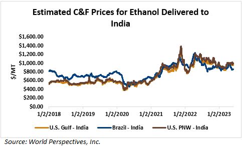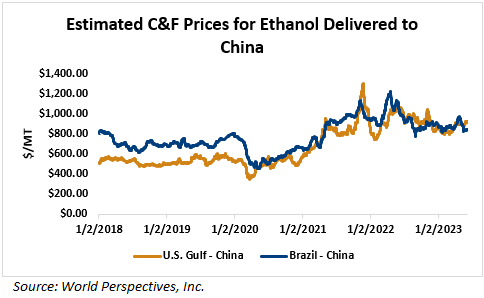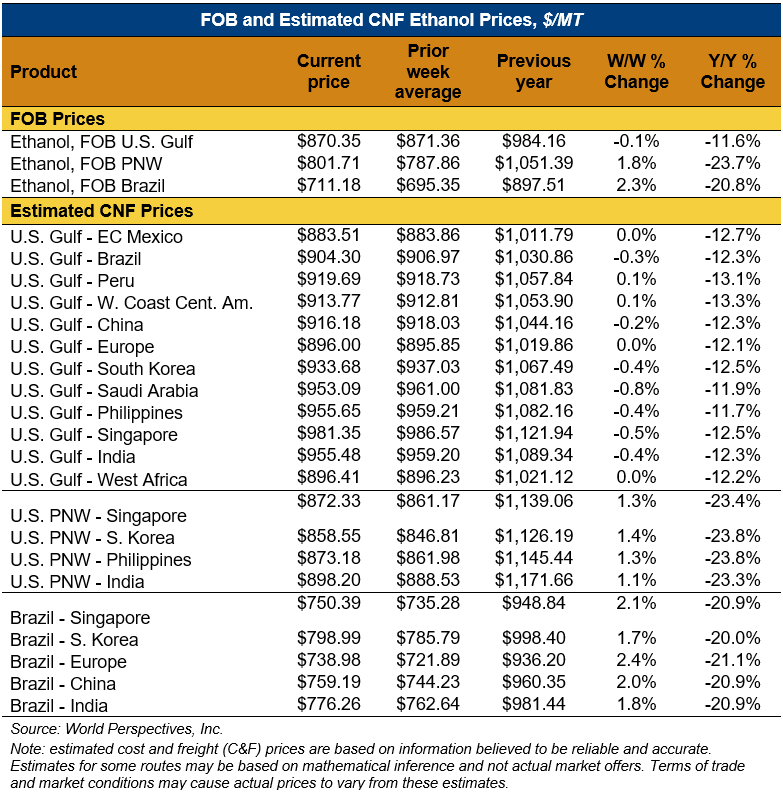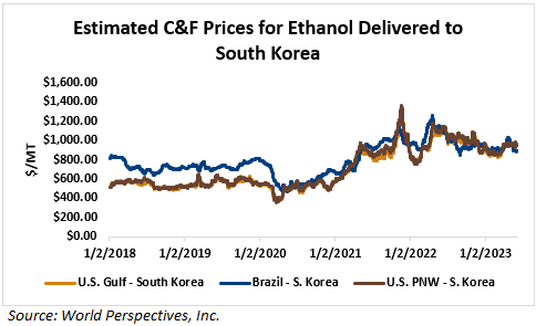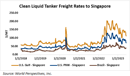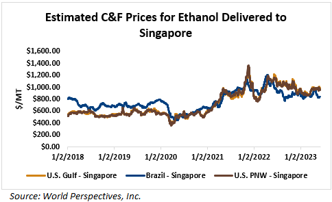 On a cost-and-freight (C&F) basis, offers are mostly higher this week as higher FOB offers for ethanol offset lower freight rates. Prices for ethanol C&F to Central America from the U.S. Gulf are up 0.1 percent this week and are down 13 percent from this same week in 2022. Values for PNW ethanol to Southeast Asia average $868.02/MT this week, up 1.3 percent from the prior week but down 23.7 percent year-over-year. That compares to U.S. Gulf to Southeast Asia C&F prices that average $956.89/MT and are down 0.4 percent from last week and are down 12.3 percent year-over-year. C&F prices for Brazilian ethanol to Southeast Asia are up 2 percent from last week.