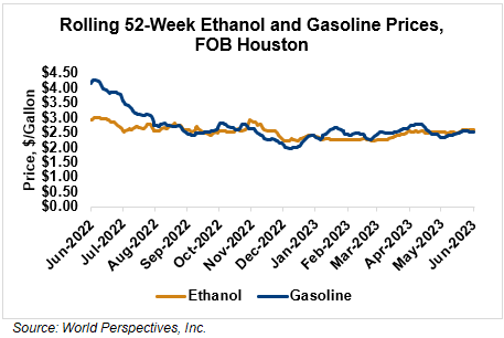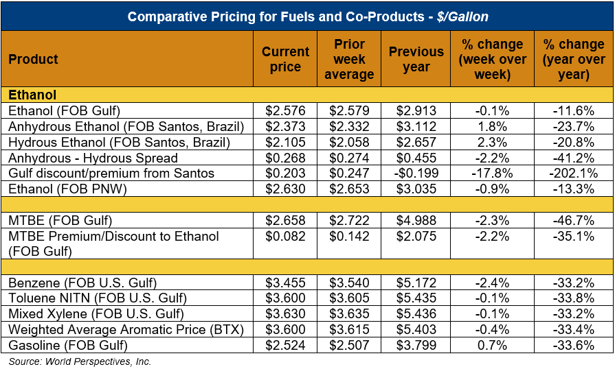 Market Outlook: U.S. ethanol prices ended last week 0.4 percent lower and remained unchanged in early week trading through Tuesday’s close. Midwest wholesale rack ethanol prices were lower to end last week and were down 0.2 percent through Tuesday’s market close to their last quote of 68.57 cents/liter (259.55 cents/gallon).