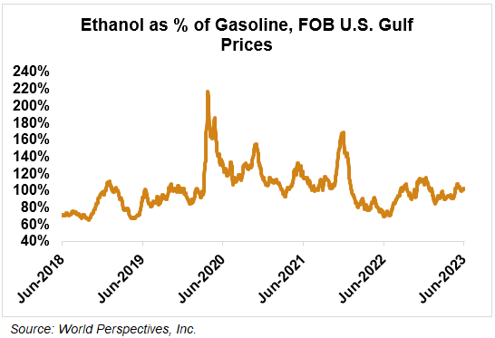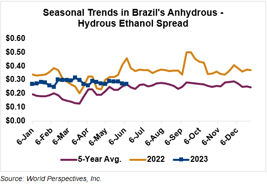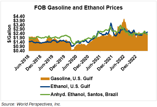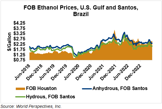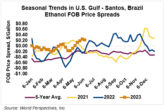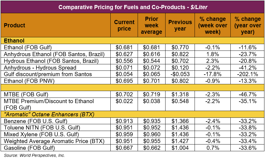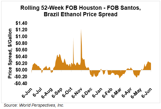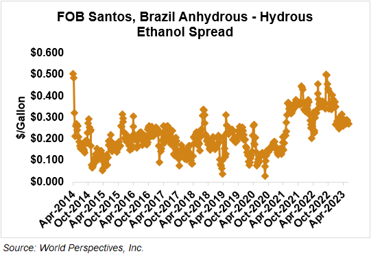 The FOB Gulf-Santos, Brazil ethanol spread has narrowed from last week’s close through Tuesday’s trading and is currently at 5.37 cents/liter (20.32 cents/gallon).