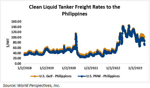 Liquid tanker rates are 1 percent lower on average this week with offers for the U.S. Gulf to the East Coast of Mexico seeing the largest gains (up 5 percent). Freight from the U.S. Gulf to Saudi Arabia saw the largest declines and is down 8 percent from last week. On average, tanker freight from the U.S. Gulf is unchanged this week while freight from the PNW has posted a 4 percent decline. Liquid tanker freight rates from Brazil are down 1 percent, on average, this week. Freight rates across all origins are 25 percent lower than this same week in 2022.