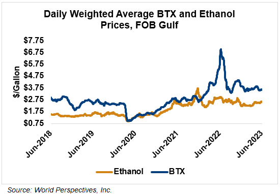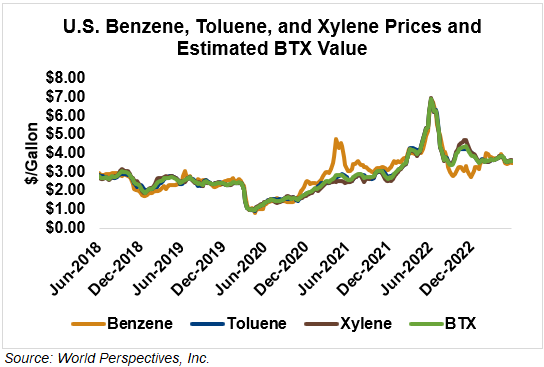 BTX component prices were higher last week but weakened slightly through Tuesday’s market close: Benzene was down 2 percent while Toluene and Xylene were unchanged. The estimated weighted average aromatic price is currently 95.26 cents/liter (360.59 cents/gallon), down from last Friday’s close. The BTX-Houston ethanol spread widened last week, and the weighted average BTX price is 27.2 cents/liter (102.97 cents/gallon) higher than the FOB Houston ethanol price.