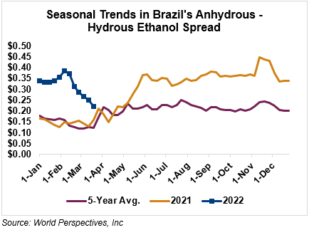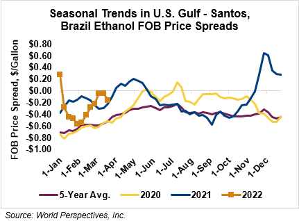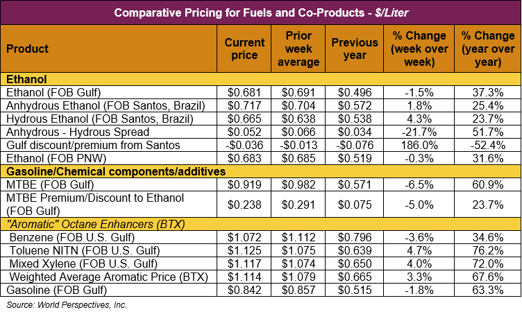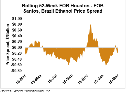 The FOB Gulf-Santos, Brazil ethanol spread has widened from last week’s close through Tuesday’s trading and is currently at -3.61 cents/liter (-13.66 cents/gallon).