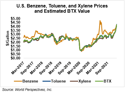 BTX component prices were sharply higher last week but are mixed through Tuesday’s market close: Benzene was down 2.1 percent while Toluene was up 4.7 percent, and Xylene was up 4.1 percent. The estimated weighted average aromatic price is currently 111.69 cents/liter (422.81 cents/gallon), up from last Friday’s close. The BTX-Houston ethanol spread widened last week, and the weighted average BTX price is 43.61 cents/liter (165.1 cents/gallon) higher than the FOB Houston ethanol price.