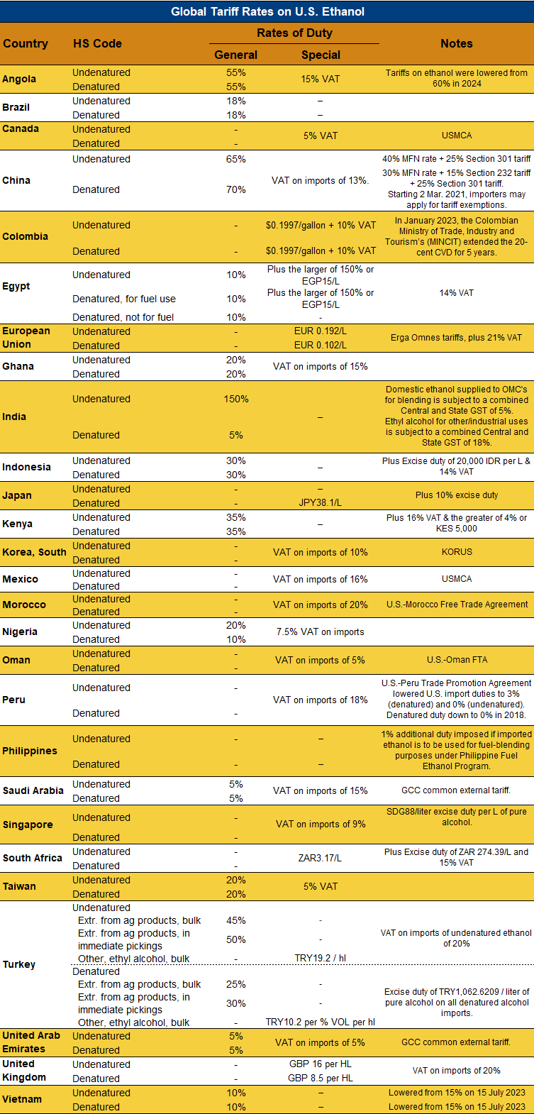 Home | BUYING & SELLING | Ethanol Reports Ethanol Market and Pricing Data – March 19, 2025 Contents Ethanol, Fuels and Co-Product Pricing Tariff Rates Additional Market Resources Download report Tariff Rates Tariff Rate Database: If you are interested in tariff rate data for all U.S. export markets, please click here.