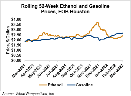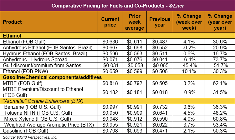 Market Outlook: U.S. ethanol prices ended last week 1.8 percent higher and traded sharply higher in early week trading, up 9.4 percent through Tuesday’s close. Midwest wholesale rack ethanol prices were higher to end last week and were up 1.6 percent through Tuesday’s market close to their last quote of 63.34 cents/liter (239.75 cents/gallon).