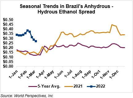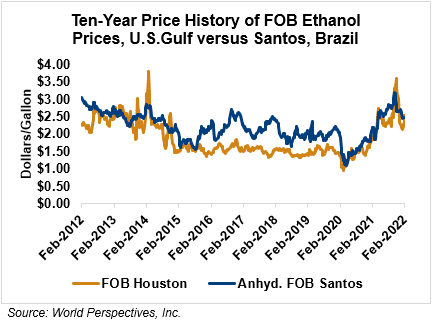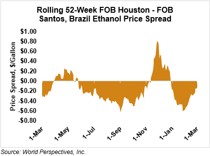 The FOB Gulf-Santos, Brazil ethanol spread has narrowed from last week’s close through Tuesday’s trading and is currently at -3.15 cents/liter (-11.92 cents/gallon).