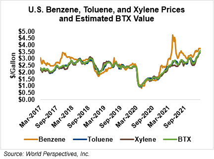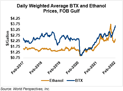 BTX component prices were mixed last week but were mixed through Tuesday’s market close: Benzene was up 0.6 percent while Toluene was up 3.8 percent, and Xylene was up 3.7 percent. The estimated weighted average aromatic price is currently 95.17 cents/liter (360.25 cents/gallon), up from last Friday’s close. The BTX-Houston ethanol spread widened last week, and the weighted average BTX price is 31.58 cents/liter (119.55 cents/gallon) higher than the FOB Houston ethanol price.