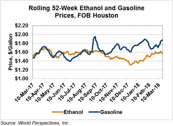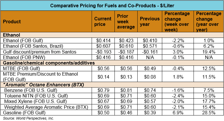 FOB Houston ethanol prices finished last week 1.5 percent lower and are now down 1.2 percent from Friday’s close. The latest quotes put FOB Houston values at 41.8 cents/liter (158.2 cents/gallon).