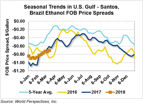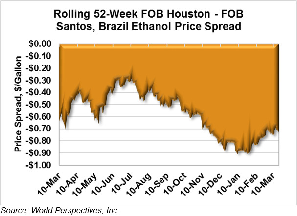 The FOB Houston-Santos spread narrowed 4.3 percent last week to -18.71 cents/liter (-70.8 cents/gallon), continuing the present narrowing trend. Early week trading shows the spread widening 1.6 percent to -19.0 cents/liter (-72.0 cents/gallon).