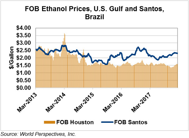 FOB Santos, Brazil ethanol prices ended last week 0.3 percent lower while this week’s prices have fallen another 0.4 percent. FOB Santos ethanol prices are currently 60.8 cents/liter, or 230.05 cents/gallon.