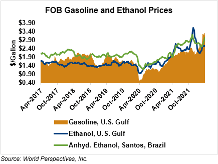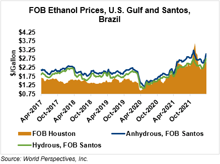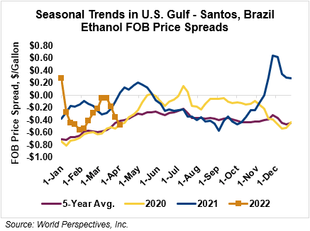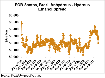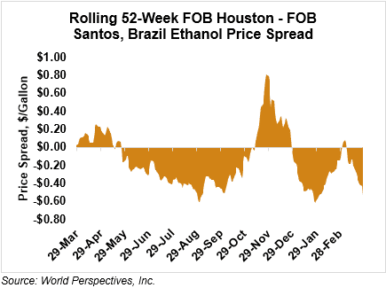 The FOB Gulf-Santos, Brazil ethanol spread has widened from last week’s close through Tuesday’s trading and is currently at -14.21 cents/liter (-53.78 cents/gallon).