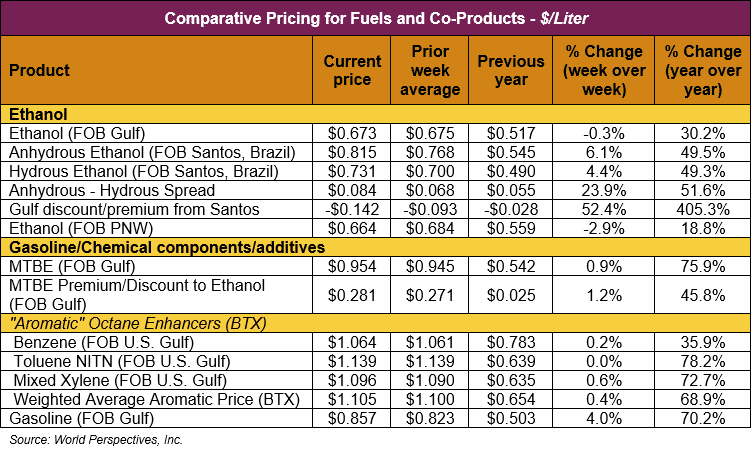 FOB Houston ethanol prices finished last week 2 percent higher but are down 0.6 percent through Tuesday’s trading from Friday’s close. FOB Houston ethanol prices are quoted at 67.29 cents/liter (254.71 cents/gallon). FOB Santos, Brazil anhydrous ethanol prices were higher last week; they are up in early week trading, rising 6.1 percent to 81.49 cents/liter (308.49 cents/gallon) through Tuesday’s trading.