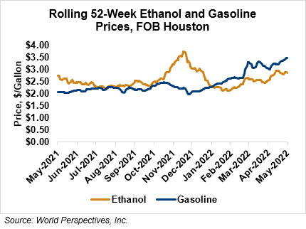 FOB Houston ethanol prices finished last week 0.8 percent higher but are down 0.3 percent through Tuesday’s trading from Friday’s close. FOB Houston ethanol prices are quoted at 75.55 cents/liter (285.99 cents/gallon). FOB Santos, Brazil anhydrous ethanol prices were lower last week; they are down in early week trading, falling 3.6 percent to 76.87 cents/liter (290.995 cents/gallon) through Tuesday’s trading.