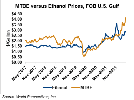 MTBE prices rose 6.5 percent last week and were higher still in early week trading, gaining 4.7 percent from Friday’s close through Tuesday’s trading. MTBE’s premium to FOB Houston ethanol has increased from last week’s report and stands at 34.57 cents/liter (130.86 cents/gallon).