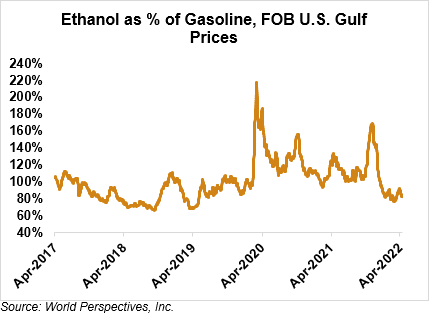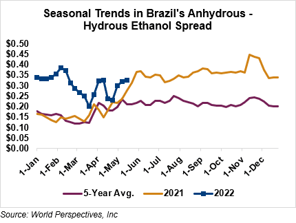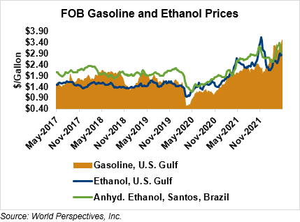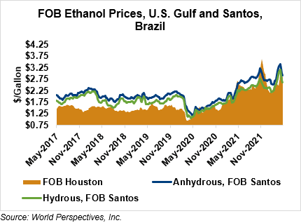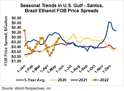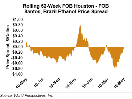 The FOB Gulf-Santos, Brazil ethanol spread has narrowed from last week’s close through Tuesday’s trading and is currently at -1.32 cents/liter (-5.01 cents/gallon).