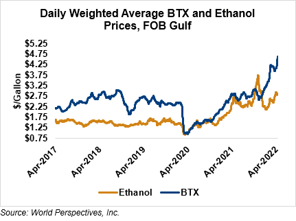 BTX component prices were mixed last week but are sharply higher through Tuesday’s market close: Benzene was up 1.7 percent while Toluene was up 6.9 percent, and Xylene was up 7 percent. The estimated weighted average aromatic price is currently 121.48 cents/liter (459.84 cents/gallon), up from last Friday’s close. The BTX-Houston ethanol spread widened last week, and the weighted average BTX price is 45.93 cents/liter (173.86 cents/gallon) higher than the FOB Houston ethanol price.