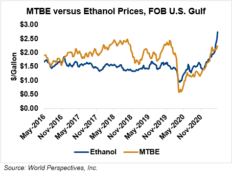 MTBE prices rose 4.4 percent last week and are firmer in early week trading, up 0.7 percent from Friday’s close through Tuesday’s trading. MTBE’s premium to FOB Houston ethanol has decreased from last week’s report and stands at -13.21 cents/liter (-50.01 cents/gallon).