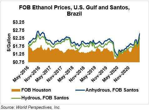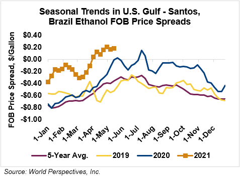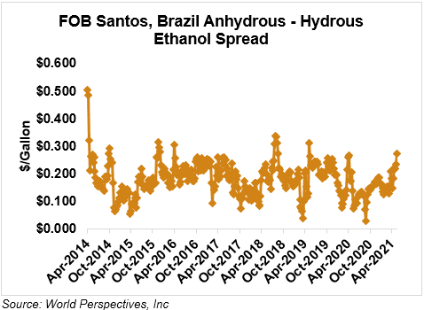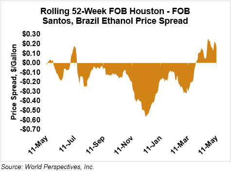 The FOB Gulf-Santos, Brazil ethanol spread has widened from last week’s close through Tuesday’s trading and is currently at 4.49 cents/liter (17.02 cents/gallon).