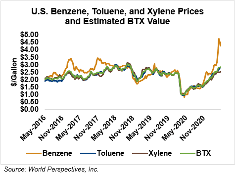 BTX component prices were mixed last week and are continuing that trend through Tuesday’s market close: Benzene is up 5.8 percent while Toluene is up 1 percent, and Xylene is down 0.2 percent. The estimated weighted average aromatic price is currently 75.61 cents/liter (286.21 cents/gallon), up from last Friday’s close. The BTX-Houston ethanol spread narrowed last week, and the weighted average BTX price is 3.26 cents/liter (12.33 cents/gallon) higher than the FOB Houston ethanol price.