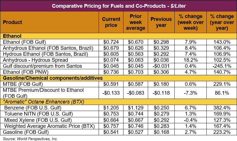 FOB Houston ethanol prices finished last week 4.9 percent higher and are up 7.9 percent through Tuesday’s trading from Friday’s close. FOB Houston ethanol prices are quoted at 72.35 cents/liter (273.88 cents/gallon). FOB Santos, Brazil anhydrous ethanol prices were higher last week; they are up in early week trading, rising 8.4 percent to 67.86 cents/liter (256.86 cents/gallon) through Tuesday’s trading.