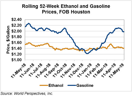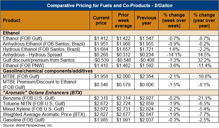 Market Outlook: U.S. ethanol prices ended last week down 1.9 percent but have rebounded and are up (+2.5 percent) in early week trading. Midwest wholesale rack ethanol prices were down 0.6 percent to end last week; they continue down this week at 38.22 cents/liter (144.66 cents/gallon) through Tuesday’s trading.