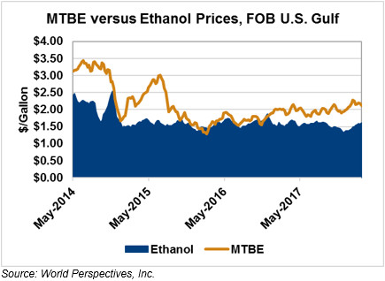 MTBE prices were down to end last week; they continue down (-2.1 percent) to start this week. MTBE’s premium to FOB Houston ethanol narrowed from last week and now stands at 14.41 cents/liter (54.55 cents/gallon).