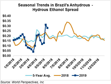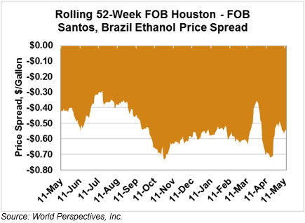 The FOB Gulf-Santos, Brazil spread narrowed slightly from last week’s close through Tuesday’s trading and is currently at -14.24 cents/liter (-53.91 cents/gallon).