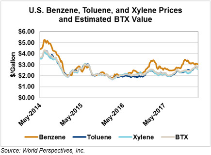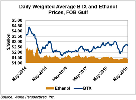 BTX component prices were down across the board to end last week and continue down through Tuesday’s trading: Benzene is down fractionally; Toluene is down 1.7 percent and Xylene down 1.9 percent. The estimated weighted average aromatic price is currently 69.55 cents/liter (263.29 cents/gallon), down 1.7 percent from last Friday’s close. The BTX-Houston ethanol spread narrowed from last week; the weighted average BTX price is now 32.24 cents/liter (122.07 cents/gallon) higher than the FOB Houston ethanol price.