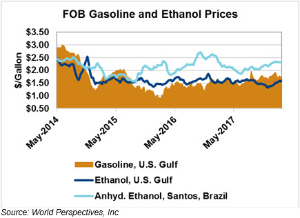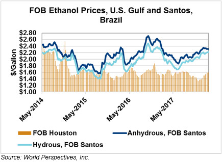 FOB Houston ethanol prices finished last week down 0.9 percent; prices are down 0.7 percent through Tuesday’s trading from Friday’s close. FOB Houston ethanol prices are quoted at 37.30 cents/liter (141.21 cents/gallon). FOB Santos, Brazil ethanol prices ended last week up 1.4 percent; they are down 0.9 percent from Friday’s close and stand at 51.54 cents/liter (195.13 cents/gallon) through Tuesday’s trading.