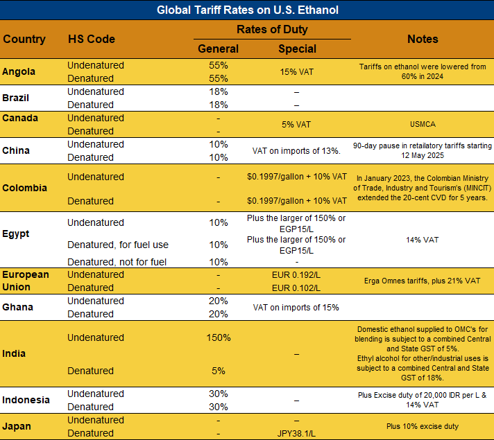 Home | BUYING & SELLING | Ethanol Reports Ethanol Market and Pricing Data – May 14, 2025 Contents Ethanol, Fuels and Co-Product Pricing Tariff Rates Additional Market Resources Download report Tariff Rates Tariff Rate Database: If you are interested in tariff rate data for all U.S. export markets, please click here.