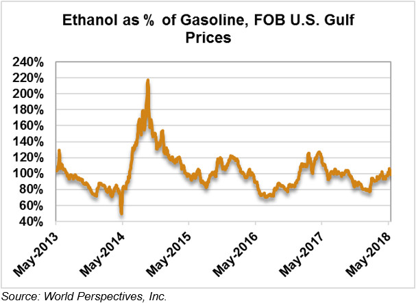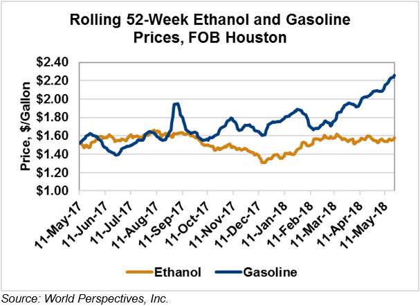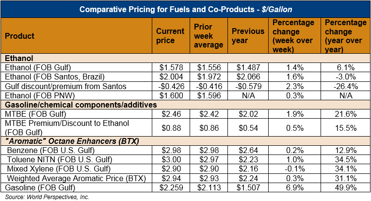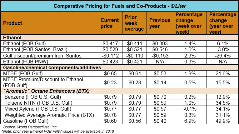 FOB Houston ethanol prices finished last week 0.5 percent higher and are up 0.3 percent through Tuesday. FOB Houston prices are quoted at 41.226 cents/liter (156.056 cents/gallon), an increase of 0.125 cents/liter (0.74 cents/gallon).