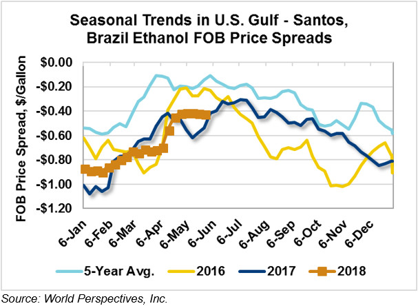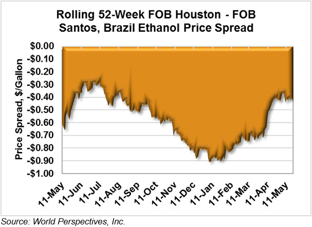 The FOB Gulf-Santos, Brazil ethanol price spread continued moving away from its seasonal low last week, widening 2.1 percent to favor U.S.-origin product. The spread is unchanged from Friday through Tuesday’s trading at -11.004 cents/liter (41.654 cents/gallon).