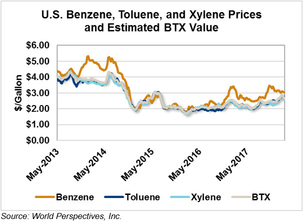 BTX component prices are steady/higher to start the week, following last week’s sharply higher trade. Benzene prices finished last week up 1.7 percent and are up another 0.1 percent so far this week. Toluene prices gained 4.0 percent last week and are 0.9 percent higher this week, while xylene prices rose 2.7 percent last week and are 0.3 percent higher this week. The estimated weighted average aromatic price is currently 77.53 cents/liter (293.50 cents/gallon), up 3.0 percent from Friday’s close. The weighted average BTX price is 36.309 cents/liter (137.44 cents/gallon) higher than FOB Houston ethanol prices.
