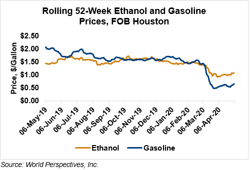 Gasoline and petroleum products were higher last week and have continued that trend in early week trading. RBOB futures are up 21.3 percent to start the week while 84 octane RBOB (Houston) and 87 octane CBOB (U.S. Gulf) gasoline prices are up 20.7 and up 24.4 percent, respectively. WTI futures are 30.2 percent higher at $25.76/barrel while Brent futures are up 17.1 percent to $30.97/barrel, from Friday through Tuesday’s close.