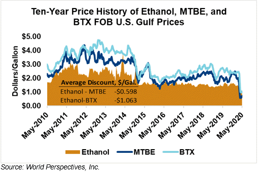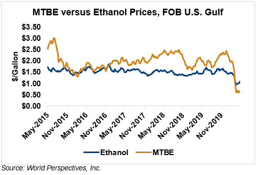 MTBE prices rose 6.4 percent last week and have extended those gains in early week trading, up 3.5 percent from Friday’s close through Tuesday’s trading. MTBE’s premium to FOB Houston ethanol has decreased from last week’s report and stands at -11.66 cents/liter (-44.13 cents/gallon).