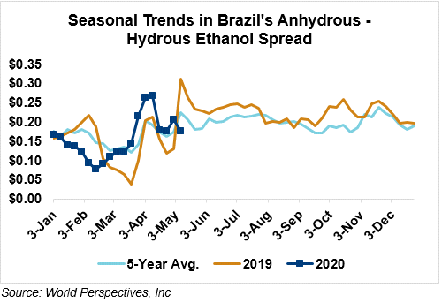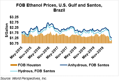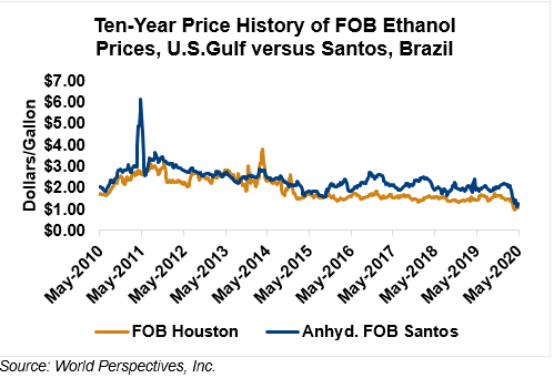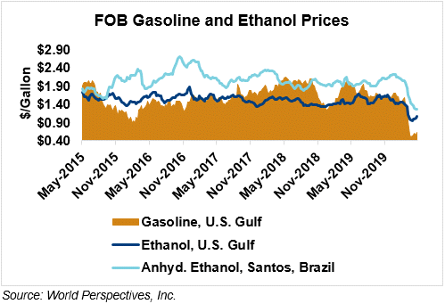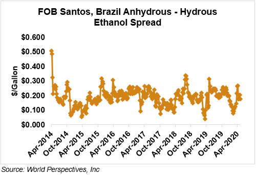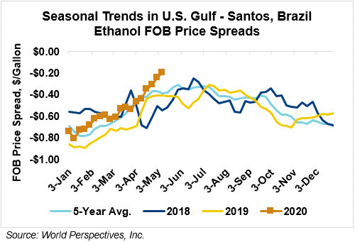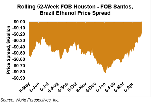 The FOB Gulf-Santos, Brazil ethanol spread has narrowed from last week’s close through Tuesday’s trading and is currently at -4.67 cents/liter (-17.69 cents/gallon).
