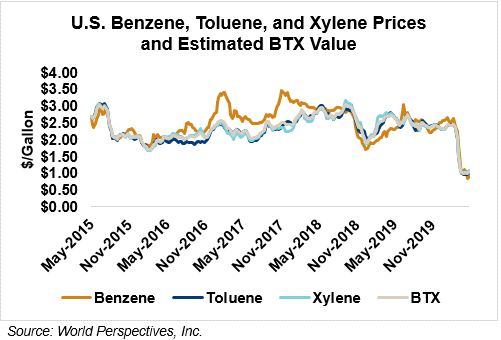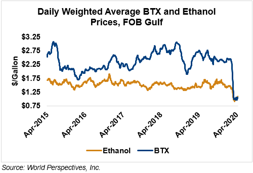 BTX component prices were mixed last week but are mostly higher through Tuesday’s market close: Benzene is up 8 percent while Toluene is up 6.6 percent, and Xylene is up 3.9 percent. The estimated weighted average aromatic price is currently 27.55 cents/liter (104.31 cents/gallon), up from last Friday’s close. The BTX-Houston ethanol spread narrowed last week, and the weighted average BTX price is -1.32 cents/liter (-4.98 cents/gallon) lower than the FOB Houston ethanol price.