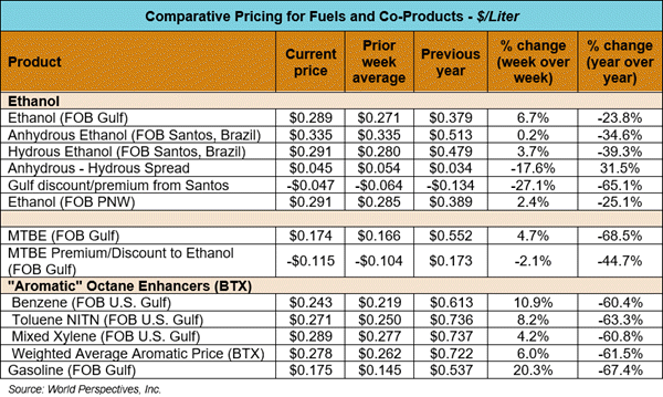 FOB Houston ethanol prices finished last week 3.6 percent higher and are up 6.7 percent through Tuesday’s trading from Friday’s close. FOB Houston ethanol prices are quoted at 28.87 cents/liter (109.29 cents/gallon). FOB Santos, Brazil anhydrous ethanol prices were lower last week; they are up in early week trading, rising 0.2 percent to 33.54 cents/liter (126.98 cents/gallon) through Tuesday’s trading.